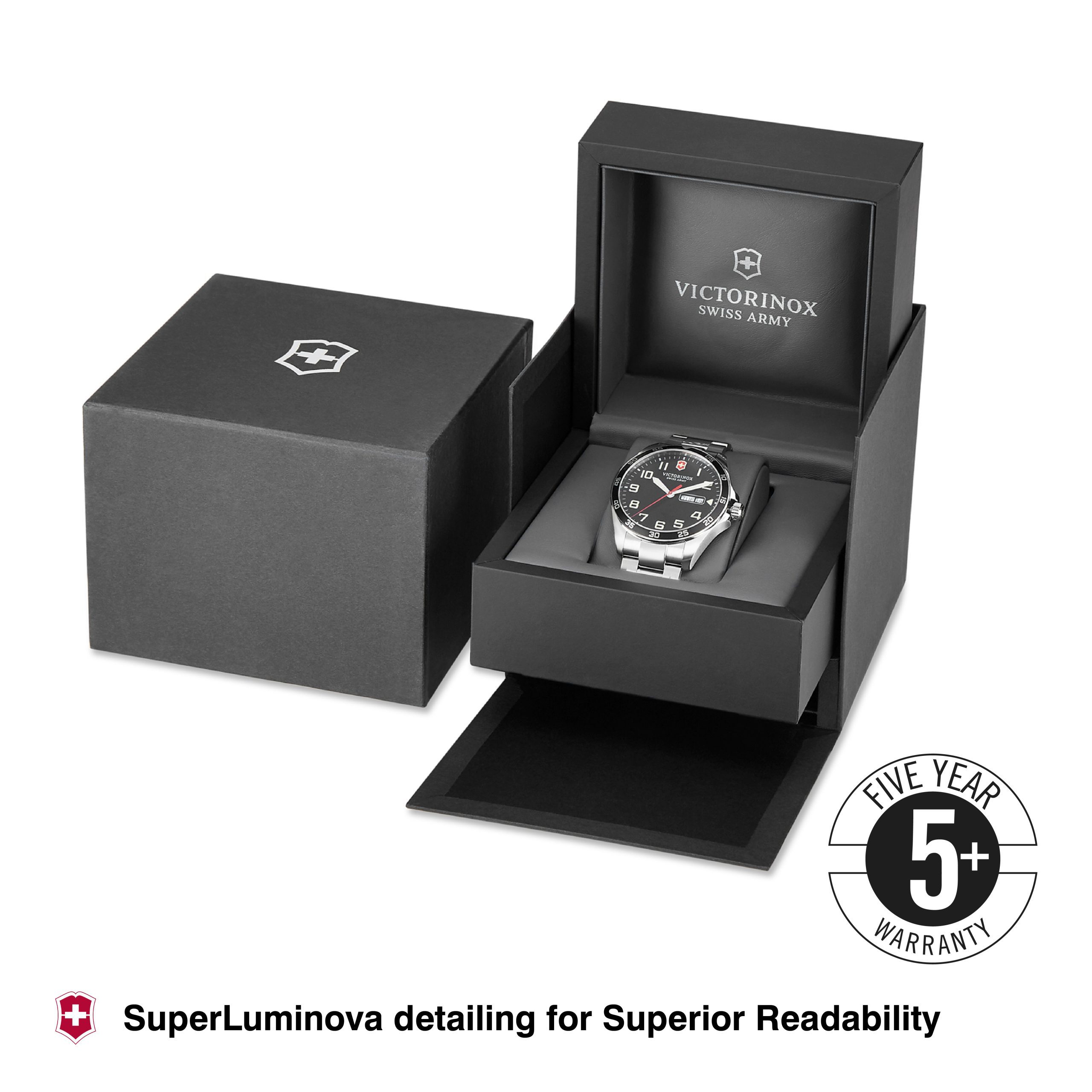 At the forefront of its field, the indispensable Fieldforce boasts striking red second hands with a Swiss Army Knife-shaped counterweight, and a red cross and shield on the dial. It offers unsurpassed day and night visibility thanks to the distinct Super-LumiNova®-enhanced display, and pays tribute to our roots with its new take on rugged, dynamic design. Know where you are, and get where you want to be, with a Fieldforce timepiece at your side.