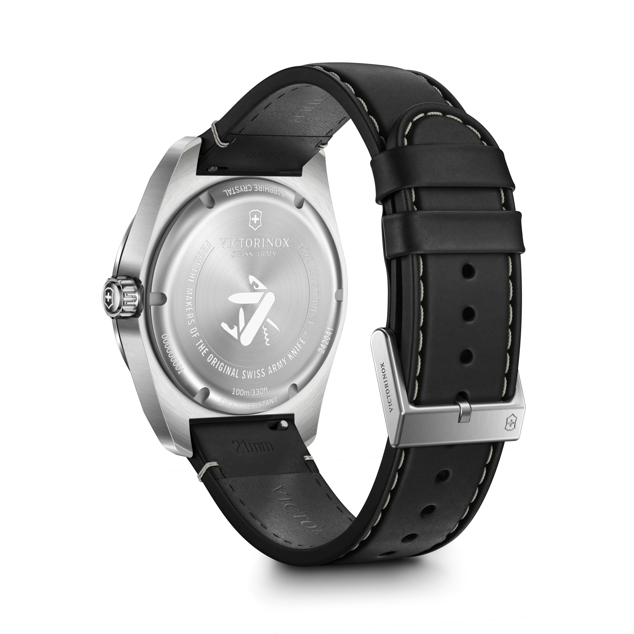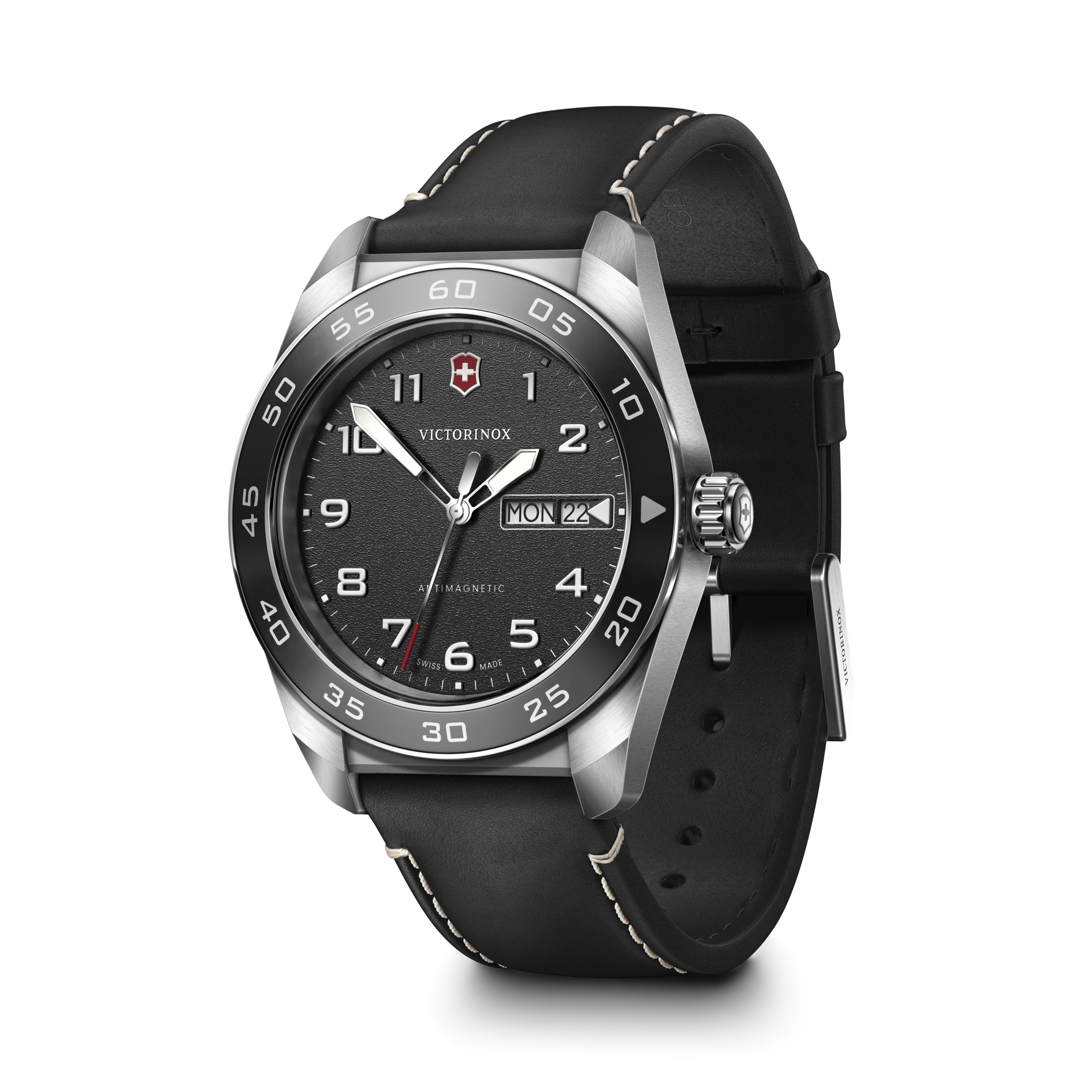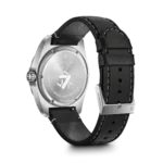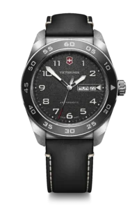 The Victorinox Swiss Army Quartz 42mm in all-black leather is the most understated watch in the range — black dial on black leather strap, day and date from the Ronda 517 at 3 o’clock, and a 10.55mm slim profile that disappears under formal wear. Sapphire crystal and SuperLumiNova as standard.